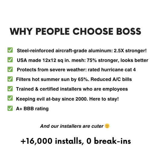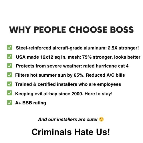 By clicking “submit”, I consent to receive SMS from Boss Security Screens. Message and data rates may apply. More details on this are in our Privacy Policy and Terms and Conditions. Text "HELP" for help or contact us at 702-637-0255. Text "STOP" to cancel.