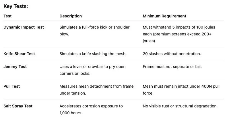 These tests simulate years of abuse in minutes — a stress gauntlet that separates decorative screens from genuine security barriers.